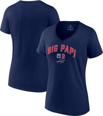 Celebrate your unwavering support for the Boston Red Sox with the Women's Fanatics Branded David Ortiz Navy Boston Red Sox Big Papi Graphic V-Neck T-Shirt. This stylish tee features screen-printed graphics of the legendary David Ortiz, showcasing your admiration for the Boston Red Sox icon. The comfortable cotton material and V-neck design make it perfect for game days or everyday wear, allowing you to proudly represent your team in style.