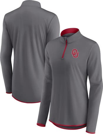 The Women's Fanatics Branded Gray Oklahoma Sooners Corner Quarter-Zip Top is the perfect way to show your support for the Oklahoma Sooners. Made of lightweight polyester, this top is perfect for mild temperatures and features a mock neck, zipper garage, and thumbholes in the cuffs for added comfort. The rounded droptail hem adds a stylish touch, and the Oklahoma Sooners logo is proudly displayed on the chest. Whether you're cheering on the Sooners at the game or just showing your support around town, this top is a must-have for any fan.