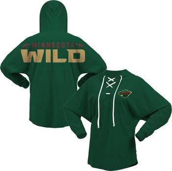 The Women's Fanatics Branded Green Minnesota Wild Jersey Lace-Up V-Neck Long Sleeve Hoodie T-Shirt is the perfect way to show your support for the Minnesota Wild. This stylish and comfortable hoodie features a lace-up V-neck, dropped shoulders, and a rounded droptail hem. The low-puff screen print graphics proudly display the Minnesota Wild logo, making it a must-have for any fan. Whether you're cheering on the Wild at the Xcel Energy Center or just relaxing at home, this hoodie is sure to keep you warm and comfortable.