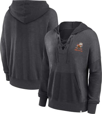 The Women's Fanatics Branded Heather Charcoal Cleveland Browns Heritage Snow Wash French Terry Lace-Up Pullover Hoodie is the perfect way to show your support for the Cleveland Browns. This midweight hoodie is made of a soft cotton and polyester blend, making it comfortable to wear all season long. The distressed screen print graphics give it a vintage look, while the lace-up front adds a touch of style. Whether you're cheering on the Browns at the stadium or just relaxing at home, this hoodie is sure to keep you warm and comfortable.