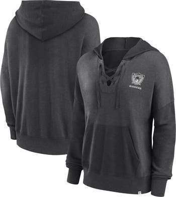 Celebrate your unwavering Las Vegas Raiders fandom with the Women's Fanatics Branded Heather Charcoal Las Vegas Raiders Heritage Snow Wash French Terry Lace-Up Pullover Hoodie. Crafted from a soft cotton and polyester blend, this midweight hoodie showcases distressed screen print graphics that proudly display your Raiders spirit. The convenient front pouch pocket provides storage, while the French terry lining ensures warmth and comfort. Whether cheering from the stands or showing support, this hoodie is the perfect way to represent the Las Vegas Raiders in style.