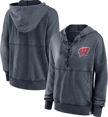 The Women's Fanatics Branded Heathered Charcoal Wisconsin Badgers Overall Speed Lace-Up Pullover Hoodie is the perfect way to show your support for the Wisconsin Badgers. This lightweight hoodie is made from a soft cotton and polyester blend, featuring a lace-up neckline, drawstring hood, and front pouch pocket. Distressed details give it a vintage look, while the French terry lining ensures warmth on chilly days. Whether cheering on the Badgers at the game or relaxing at home, this hoodie is a must-have for any fan.
