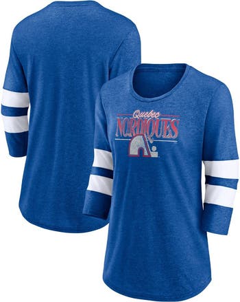 The Women's Fanatics Branded Heathered Royal/White Quebec Nordiques Full Shield 3/4-Sleeve Tri-Blend Raglan Scoop Neck T-Shirt is a must-have for any true Quebec Nordiques fan. With its contrast-color inserts and distressed screen print graphics, this shirt is sure to turn heads. The rounded hem adds a touch of style, while the polyester, cotton, and rayon blend ensures comfort and durability. Whether you're cheering on the Nordiques at the rink or just showing your support around town, this shirt is the perfect way to represent your favorite team.