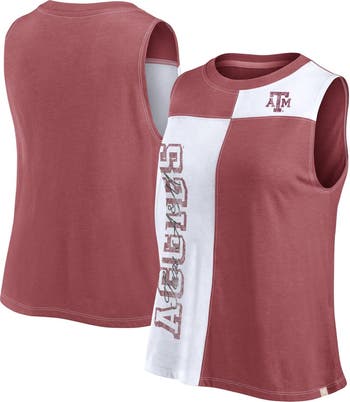 The Women's Fanatics Branded Maroon/White Texas A&M Aggies Colorblock High Neck Tank Top is the perfect way to show your support for the Texas A&M Aggies. Made from a comfortable cotton and polyester blend, this tank top features a distressed screen print graphic of the Texas A&M Aggies logo, as well as a crew neck for a classic look. Whether you're cheering on the Aggies at a game or just showing your team spirit around town, this tank top is sure to become a favorite.