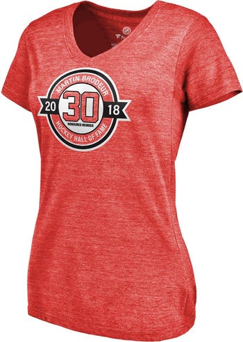 Celebrate your unwavering loyalty to the New Jersey Devils with the Women's Fanatics Branded Martin Brodeur Red New Jersey Devils Hall of Fame V-Neck Tri-Blend T-Shirt. This comfortable tri-blend of cotton, polyester, and rayon features screen print graphics that proudly display the iconic New Jersey Devils logo and the legendary Martin Brodeur's name, honoring his Hall of Fame induction. Whether you're cheering from the stands or simply showing your support, this t-shirt is the perfect way to represent the New Jersey Devils and pay homage to one of the greatest players in NHL history.