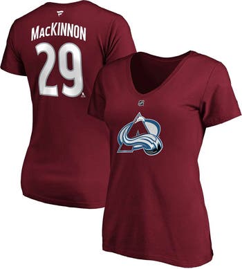 Ensure everybody can see who your favorite Colorado Avalanche player is by wearing this Nathan MacKinnon Name and Number T-shirt from Fanatics Branded. It features the Colorado Avalanche logo printed on the front and Nathan MacKinnon graphics on the back. The lightweight material will also help make this V-neck tee comfortable to wear all day.