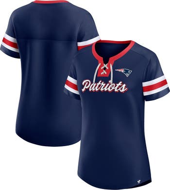 The Women's Fanatics Branded Navy New England Patriots Original State Lace-Up T-Shirt is a stylish and comfortable way to show your support for the New England Patriots. The lace-up neckline and mesh sleeves add a touch of femininity, while the screen print graphics and sewn-on sleeve stripes proudly display your team pride. Made from durable polyester, this t-shirt is perfect for game day or any day you want to show your Patriots spirit.