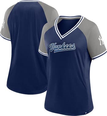 The Women's Fanatics Branded Navy New York Yankees Glitz & Glam League Diva Raglan V-Neck T-Shirt is the perfect way to show your support for the New York Yankees. With its raglan sleeves and mesh side panels, this shirt is both stylish and comfortable. The navy color and Yankees logo make it clear that you're a true fan. Whether you're cheering on the Yankees at the stadium or just hanging out with friends, this shirt is sure to turn heads.