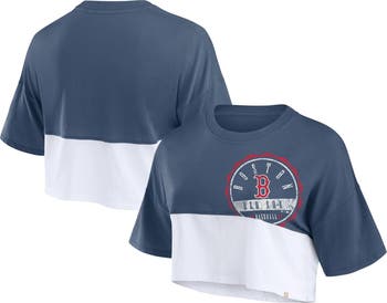Celebrate your unwavering Boston Red Sox fandom with the Women's Fanatics Branded Navy/White Boston Red Sox Color Split Boxy Cropped T-Shirt. This stylish tee features a cropped design and distressed details, adding an edgy touch to your game-day attire. The woven tag proudly displays the Boston Red Sox logo, solidifying your allegiance to the beloved MLB team.