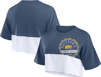 Celebrate your unwavering Cal Bears spirit with the Women's Fanatics Branded Navy/White Cal Bears Oversized Badge Colorblock Cropped T-Shirt. This stylish tee features distressed screen print graphics that proudly display your Cal Bears pride. The cropped hem and crew neck provide a comfortable and flattering fit, perfect for game days or everyday wear. Show your support for the Cal Bears in this eye-catching and spirited T-shirt.