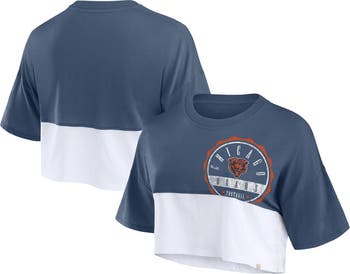The Women's Fanatics Branded Navy/White Chicago Bears Boxy Color Split Cropped T-shirt is the perfect way to show your support for the Chicago Bears. With its cropped hem and screen-printed graphics, this shirt is both stylish and comfortable. Made from a soft rayon and spandex blend, this shirt will keep you cool and comfortable all game long. Whether you're cheering from the stands or watching from home, this shirt is sure to show your Chicago Bears pride.