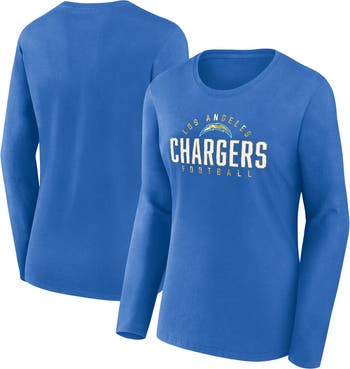 The Women's Fanatics Branded Powder Blue Los Angeles Chargers Plus Size Foiled Play Long Sleeve T-shirt is the perfect way to show your support for the Los Angeles Chargers. Made from soft cotton, this shirt features screen print graphics with glitter detail that will make you stand out from the crowd. Whether you're cheering on the Chargers at the stadium or just hanging out at home, this shirt is sure to become a favorite.