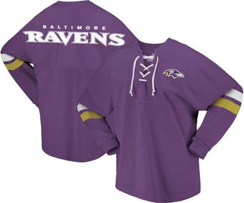 The Women's Fanatics Branded Purple Baltimore Ravens Spirit Jersey Lace-Up V-Neck Long Sleeve T-Shirt is the perfect way to show your unwavering support for the Baltimore Ravens. With its dropped shoulders, low-puff screen print graphics, and rounded droptail hem, this jersey is both stylish and comfortable. The V-neck with lace-up detail adds a touch of femininity, making it a great choice for any Ravens fan. Whether you're cheering on the Ravens at the stadium or just relaxing at home, this jersey is sure to become a favorite.