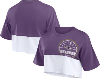 The Women's Fanatics Branded Purple/White Baltimore Ravens Boxy Color Split Cropped T-shirt is the perfect way to show unwavering support for the Baltimore Ravens. This stylish tee features a cropped hem and screen-printed graphics that proudly display the Ravens logo. Made from a comfortable rayon and spandex blend, this shirt is perfect for game day or any day you want to show your Ravens pride. With its bold colors and comfortable fit, this shirt is sure to become a favorite. Whether you're cheering on the Ravens at the stadium or just hanging out at home, this shirt is the perfect way to show your team spirit.