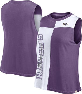 Celebrate your unwavering Baltimore Ravens fandom with the Women's Fanatics Branded Purple/White Baltimore Ravens Script Color Block Tank Top. This tank features heat-sealed graphics and distressed screen print graphics, showcasing your Ravens pride with bold and vibrant colors. Contrast color stitching adds a stylish touch, making this tank a must-have for any Ravens fan. Whether you're cheering from the stands or simply showing your support, this tank is the perfect way to represent the Baltimore Ravens.