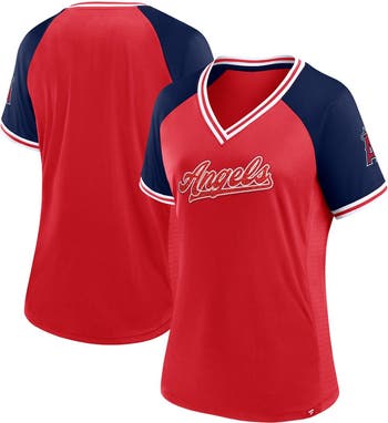 The Women's Fanatics Branded Red Los Angeles Angels Glitz & Glam League Diva Raglan V-Neck T-Shirt is the perfect way to show your support for the Los Angeles Angels. With its raglan sleeves and mesh side panels, this shirt is both stylish and comfortable. The vibrant red color and bold graphics will make you stand out from the crowd, whether you're at the game or cheering from home.