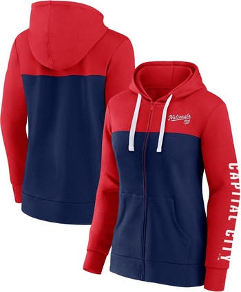 The Women's Fanatics Branded Red/Navy Washington Nationals Take The Field Colorblocked Hoodie Full-Zip Jacket is the perfect way to show your support for the Washington Nationals. This midweight jacket is made of a soft cotton and polyester blend, and features a fleece lining for added warmth. The full-zip design makes it easy to get on and off, and the hood with drawstring provides extra protection from the elements. The jacket also has two front pockets for storing your essentials. Represent your Washington Nationals pride with this jacket, whether you're cheering them on at the stadium or relaxing at home.