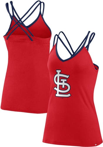 The Women's Fanatics Branded Red St. Louis Cardinals Barrel It Up Cross Back V-Neck Tank Top is the perfect way to show your support for the St. Louis Cardinals. With its screen print graphics and spaghetti straps that cross in the back, this tank top is both stylish and comfortable. The V-neck design adds a touch of femininity, while the cotton material ensures you'll stay cool and comfortable all day long. Whether you're cheering on the Cardinals at the stadium or just relaxing at home, this tank top is a must-have for any fan.