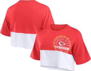 The Women's Fanatics Branded Red/White Kansas City Chiefs Boxy Color Split Cropped T-Shirt is the perfect way to show your support for the Kansas City Chiefs. With its cropped hem and screen print graphics, this shirt is both stylish and comfortable. Made from a soft rayon and spandex blend, this shirt is perfect for game day or any day. Whether you're cheering on the Chiefs from the stands or just hanging out at home, this shirt is sure to show your team spirit.