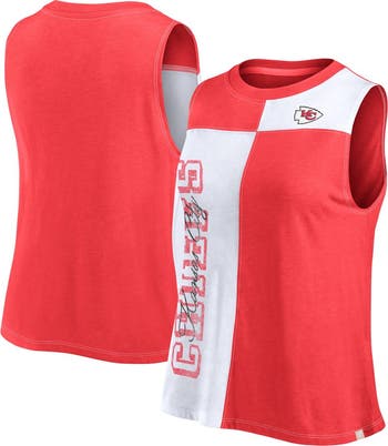 The Women's Fanatics Branded Red/White Kansas City Chiefs Script Color Block Tank Top is a must-have for any devoted Kansas City Chiefs fan. With its heat-sealed and distressed screen print graphics, this tank top proudly displays your unwavering support for the Chiefs. The contrast color stitching adds a touch of style, making it the perfect way to show your team spirit on game day or any day. Whether you're cheering on the Chiefs at the stadium or just hanging out at home, this tank top is a must-have for any fan.