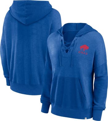 The Women's Fanatics Branded Royal Buffalo Bills Heritage Snow Wash French Terry Lace-Up Pullover Hoodie is the perfect way to show your unwavering support for the Buffalo Bills. Crafted from a soft cotton and polyester blend, this midweight hoodie is suitable for moderate temperatures. Distressed screen print graphics add a touch of vintage style, while the front pouch pocket provides convenient storage for your essentials. Whether you're cheering from the stands or simply showing your Bills pride, this hoodie is a must-have for any true fan.
