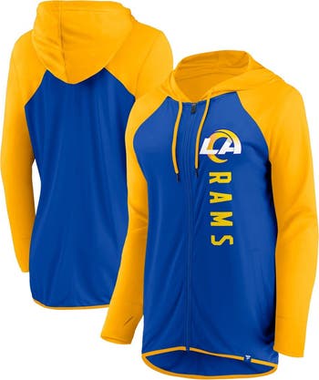 The Women's Fanatics Branded Royal/Gold Los Angeles Rams Forever Fan Full-Zip Hoodie is the ultimate symbol of your unwavering support for the Rams. Heat-sealed graphics proudly display the team logo, while two side pockets provide ample storage for game day essentials. The rounded bottom hem and thumbholes in the cuffs ensure a comfortable and secure fit, making this hoodie the perfect choice for cheering on your team from the stands or the comfort of your own home.