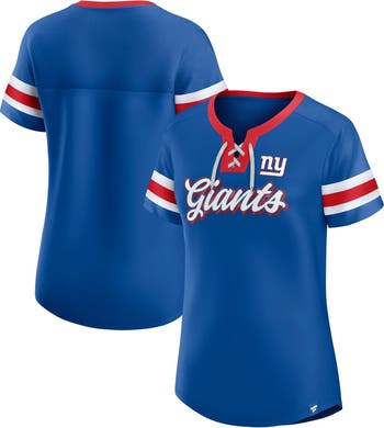 The Women's Fanatics Branded Royal New York Giants Original State Lace-Up T-Shirt is a stylish and spirited way to show your unwavering support for the New York Giants. Its lace-up neckline and mesh sleeves add a touch of femininity, while the screen-printed graphics proudly display your Giants pride. Whether you're cheering from the stands or simply showing your support, this t-shirt is the perfect way to represent the New York Giants in style.