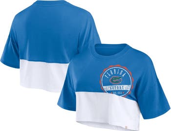 The Women's Fanatics Branded Royal/White Florida Gators Oversized Badge Colorblock Cropped T-Shirt is the perfect way to show your support for the Florida Gators. This stylish tee features a distressed screen print graphic of the Gators logo and a cropped hem that hits above the waist. Made from a comfortable cotton and polyester blend, this shirt is perfect for game day or any day. Whether you're cheering on the Gators from the stands or just showing your support around town, this shirt is sure to turn heads. The oversized badge graphic is a bold statement of your Florida Gators pride, and the cropped hem gives the shirt a modern and stylish look. Made from a soft and comfortable cotton and polyester blend, this shirt is perfect for all-day wear.