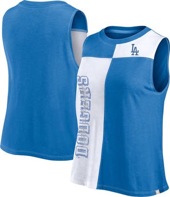 The Women's Fanatics Branded Royal/White Los Angeles Dodgers Color-Block Tank Top is the perfect way to show your support for the Los Angeles Dodgers. Made from a comfortable cotton and polyester blend, this tank top features a distressed design for a vintage look and flatlock stitching for durability. The crew neck and sleeveless design make it perfect for warm weather, and the Los Angeles Dodgers logo proudly displayed on the front will let everyone know who you're rooting for.