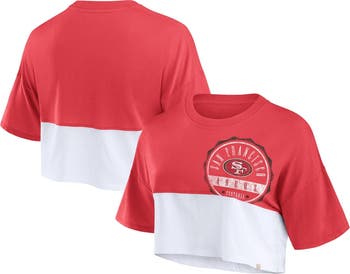 The Women's Fanatics Branded Scarlet/White San Francisco 49ers Boxy Color Split Cropped T-Shirt is the perfect way to show your support for the San Francisco 49ers. This stylish tee features a cropped hem and screen-printed graphics that proudly display your team pride. Made from a comfortable rayon and spandex blend, this shirt is perfect for game day or any day you want to show your love for the San Francisco 49ers.