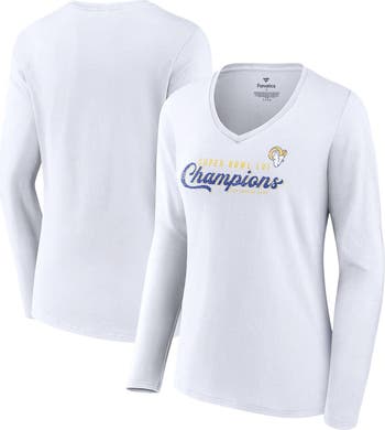 Celebrate the Los Angeles Rams' Super Bowl LVI triumph with the Women's Fanatics Branded White Los Angeles Rams Super Bowl LVI Champions Long Sleeve V-Neck T-Shirt. This commemorative tee features screen print graphics that proudly display the Rams' victory, a must-have for any devoted fan. Show unwavering support for the Los Angeles Rams and commemorate their historic achievement with this stylish and meaningful piece of memorabilia.