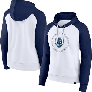 The Women's Fanatics Branded White/Navy Sporting Kansas City Instep Pullover Hoodie is the perfect way to show your support for your favorite team. Made from a soft cotton and polyester blend, this midweight hoodie is perfect for moderate temperatures. The French terry lining and raglan sleeves provide added comfort and mobility, while the Sporting Kansas City graphics proudly display your team spirit. Whether you're cheering from the stands or just relaxing at home, this hoodie is sure to keep you comfortable and stylish.