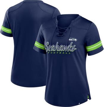 Women's Fanatics Seattle Seahawks Play Script Lace-Up T-Shirt. Crafted from 100% polyester, this comfy T-shirt offers a stylish and sporty look with its lace-up neckline and stylized team wordmark printed across the torso. The mesh sleeves and shoulders provide enhanced breathability and added comfort, while the side split hems allow for freer movement. The contrast-color, sewn-on stripes add a touch of extra flair to this game-day essential. Whether you're watching the Seahawks on the field or cheering from home, this stylish T-shirt is sure to turn heads and show your love for the team.