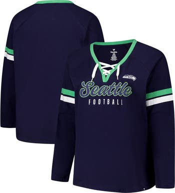 Embrace your Seattle Seahawks fandom with this stylish and comfortable Won & Done Long Sleeve Lace-Up V-Neck T-Shirt from Fanatics. This 100% cotton tee features raglan sleeves and a rounded hem with side splits for a full range of motion. Plus, the lace-up V-neck and sewn-on sleeve stripes add stylish detail to this comfy top.