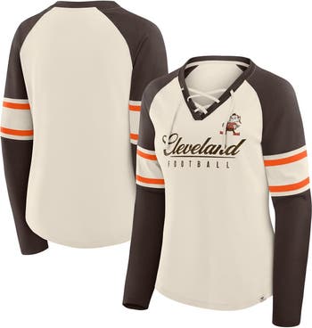 Dress in sporty retro fashion on Cleveland Browns game day with this Hometown Gridiron Hero Raglan Lace-Up V-Neck Long Sleeve T-Shirt by Fanatics. Its two-tone design features raglan sleeves for ease of movement and a stylish lace-up neckline. Crafted from lightweight jersey fabric, this Cleveland Browns tee offers a comfortable, breathable feel all day.