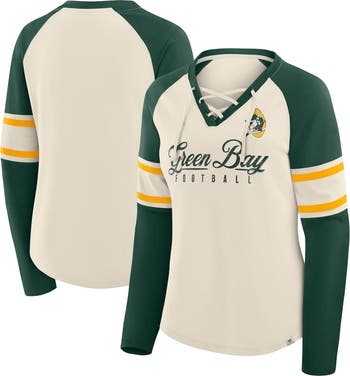 Women's Fanatics Cream/Green Green Bay Packers Hometown Gridiron Hero Raglan Lace-Up V-Neck Long Sleeve T-Shirt