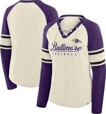 Dress in sporty retro fashion on Baltimore Ravens game day with this Hometown Gridiron Hero Raglan Lace-Up V-Neck Long Sleeve T-Shirt by Fanatics. Its two-tone design features raglan sleeves for ease of movement and a stylish lace-up neckline. Crafted from lightweight jersey fabric, this Baltimore Ravens tee offers a comfortable, breathable feel all day.