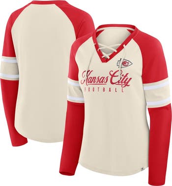 Dress in sporty retro fashion on Kansas City Chiefs game day with this Hometown Gridiron Hero Raglan Lace-Up V-Neck Long Sleeve T-Shirt by Fanatics. Its two-tone design features raglan sleeves for ease of movement and a stylish lace-up neckline. Crafted from lightweight jersey fabric, this Kansas City Chiefs tee offers a comfortable, breathable feel all day.