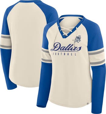 Dress in sporty retro fashion on Dallas Cowboys game day with this Hometown Gridiron Hero Raglan Lace-Up V-Neck Long Sleeve T-Shirt by Fanatics. Its two-tone design features raglan sleeves for ease of movement and a stylish lace-up neckline. Crafted from lightweight jersey fabric, this Dallas Cowboys tee offers a comfortable, breathable feel all day.