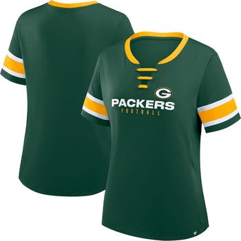 Cheer on the Green Bay Packers in trendy apparel with this Redzone Draw Play Athena Lace-Up T-Shirt by Fanatics. Stretch jersey fabric provides a lightweight feel, while the classic fit creates a flattering silhouette. Rubberized team details and a faux lace-up neckline add stylish touches to this comfortable Green Bay Packers tee.