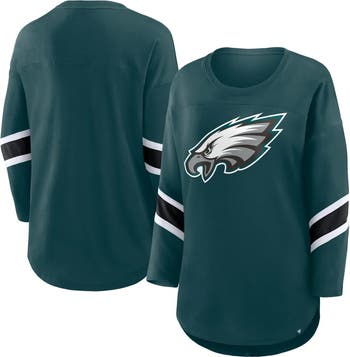 Declare your unwavering allegiance to the Philadelphia Eagles with this stylish and comfortable Plus Size Redzone 3/4-Sleeve Scoop Neck T-Shirt from Fanatics. Featuring a relaxed fit and classic hip length, this tee ensures a comfortable and flattering look for any fan. The lightweight jersey fabric and dropped shoulder seams provide ease of movement, perfect for cheering on the team from the stands or relaxing at home. The heat-sealed silicone Philadelphia Eagles logo has a smooth, rubberized finish designed to stretch without cracking, ensuring long-lasting quality.