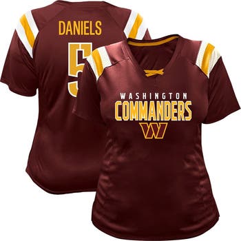 Represent your favorite player in a stylish and comfortable way with this Washington Commanders Plus Size Name & Number Raglan Lace V-Neck T-Shirt from Fanatics. The lightweight, breathable fabric will keep you feeling cool and comfortable, whether you're at the stadium or running errands around town. The heat-sealed Jayden Daniels graphics and raglan sleeves ensure you'll be repping your favorite player and team in style.