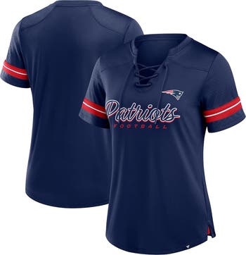 Channel your New England Patriots pride with a trendy look by grabbing with this Fanatics Play Script Lace-Up T-Shirt. The stylized team wordmark printed across the torso proudly displays your love for your NFL squad, while the contrast-color, sewn-on stripes add a touch of sporty flair. The mesh sleeves and collar keep this top breathable, while the split hems ensure it rests comfortable at the waist when you're cheering your New England Patriots all the way to a big win.