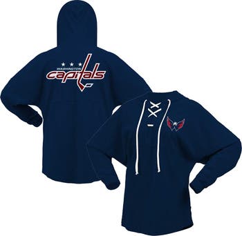 The Women's Fanatics Navy Washington Capitals Jersey Lace-Up V-Neck Long Sleeve Hoodie T-Shirt is the perfect way to show your support for the Washington Capitals. This stylish and comfortable hoodie features a lace-up V-neck, dropped shoulders, and a rounded droptail hem. The low-puff screen print graphics proudly display the Washington Capitals logo, making this hoodie a must-have for any fan. Whether you're cheering on the Capitals at the game or just relaxing at home, this hoodie is sure to keep you warm and comfortable.