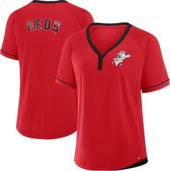 Channel vintage vibes while repping the Cincinnati Reds in this Cooperstown Collection League Diva Raglan V-Neck T-Shirt from Fanatics. The lightweight, breathable fabric makes this tee a comfortable option for warm game days. Plus, shimmering foil detailing adds just the right amount of eye-catching flair to the Cincinnati Reds graphics.