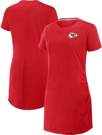 Combine fashion and fandom with this Kansas City Chiefs RuchedDrape T-Shirt Dress by Fanatics. Its flattering design features a crossed rounded hem and ruching at the left hip area. The embroidered team logo lets you support the Kansas City Chiefs in chic style.