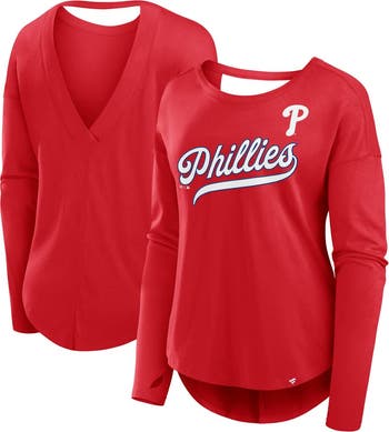 Complete your game day look with this Philadelphia Phillies Core Boat Neck Long Sleeve T-Shirt from Fanatics. This long sleeve tee features dropped shoulder seams and an open back for a relaxed, flowy fit. With the Phillies logo on the chest and team script across the front, your fandom will be on full display.