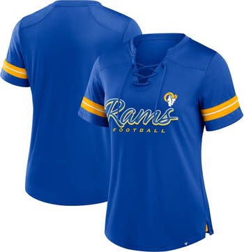 Channel your Los Angeles Rams pride with a trendy look by grabbing with this Fanatics Play Script Lace-Up T-Shirt. The stylized team wordmark printed across the torso proudly displays your love for your NFL squad, while the contrast-color, sewn-on stripes add a touch of sporty flair. The mesh sleeves and collar keep this top breathable, while the split hems ensure it rests comfortable at the waist when you're cheering your Los Angeles Rams all the way to a big win.