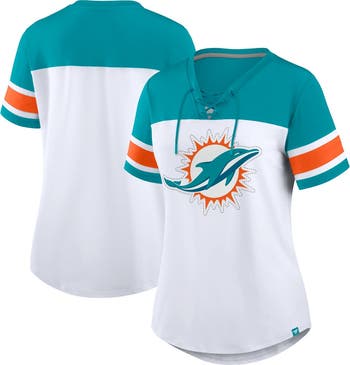 Your Miami Dolphins fandom shines when you step out in this Athena Rhinestone Lace-Up V-Neck T-Shirt by Fanatics. Its rhinestone embellishments and lace-up neckline create a sparkly, eye-catching design that puts attention on your favorite team. Stretch jersey fabric delivers a lightweight feel, while the rounded hem provides a more relaxing fit, making this Miami Dolphins tee comfortable to wear all day.