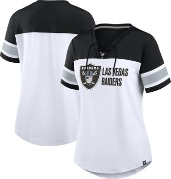 Your Las Vegas Raiders fandom shines when you step out in this Athena Lace-Up V-Neck T-Shirt by Fanatics. Its sleeve stripes and lace-up neckline create an eye-catching design that puts attention on your favorite team. Stretch jersey fabric delivers a lightweight feel, while the rounded hem provides a more relaxing fit, making this Las Vegas Raiders tee comfortable to wear all day.